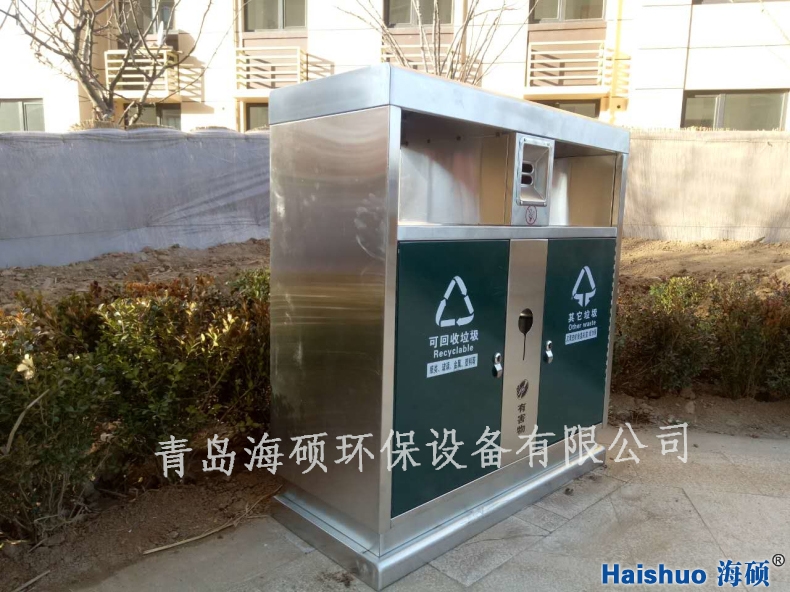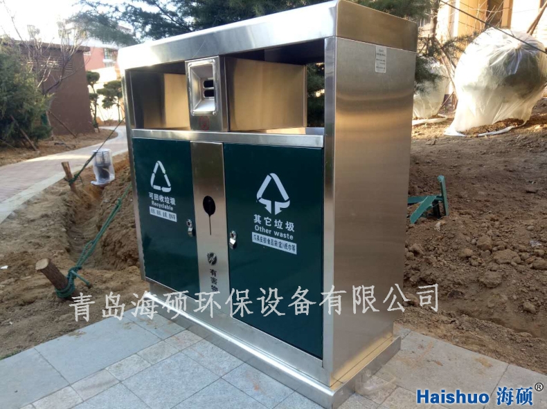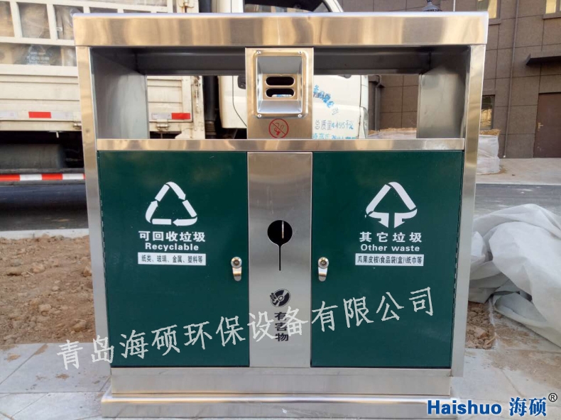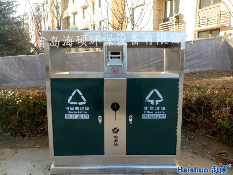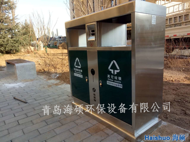 青島海碩環(huán)保設備有限公司為青島某小區(qū)安裝戶外果皮箱,產品經久耐用,清洗方便。